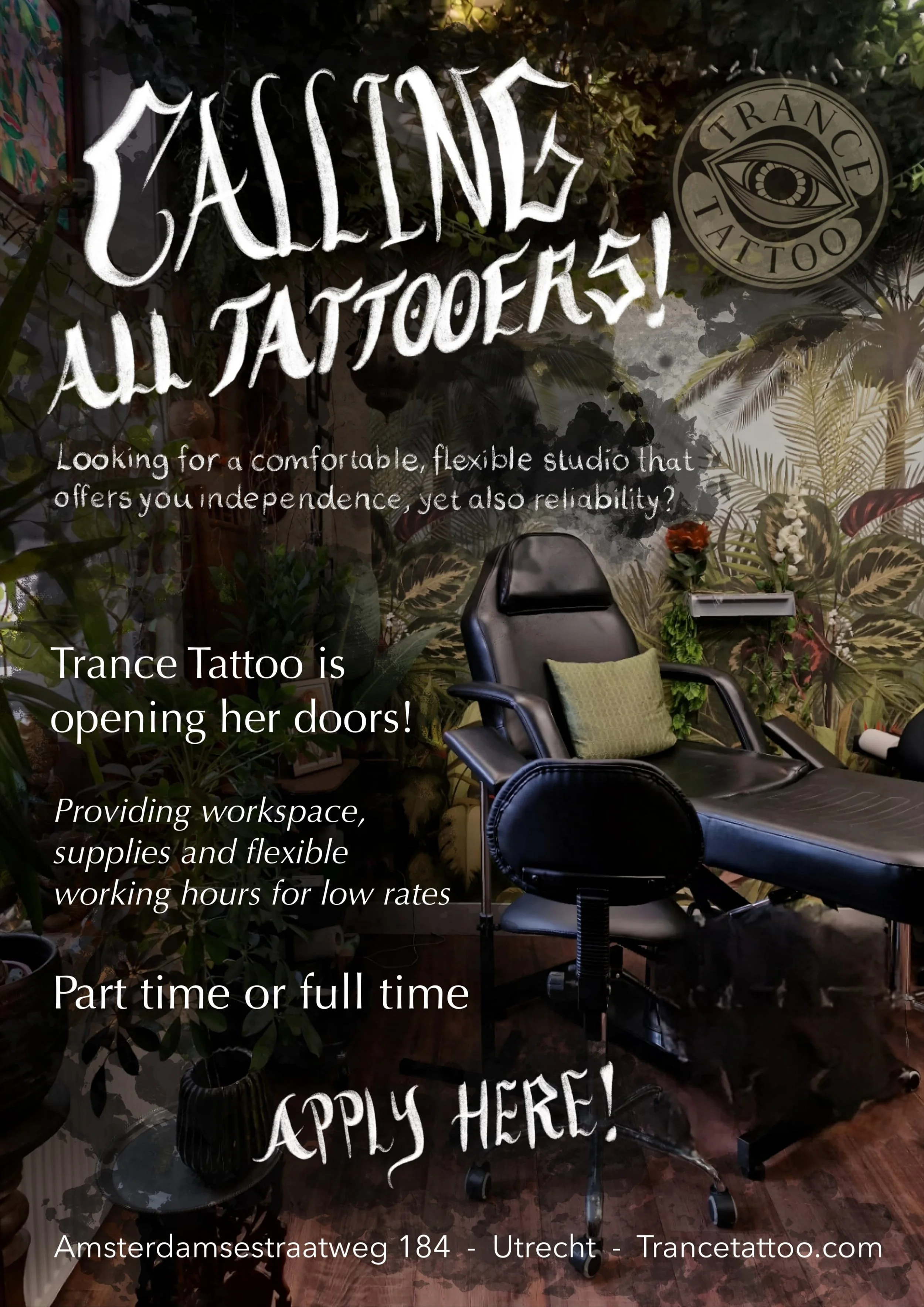 Over the past years, Trance Tattoo has grown into a trusted tattoo space to many of my clients and myself. It’s been a blessing to learn, grow and experience what I have, in my own tattoo studio. However, life needs to keep evolving, that’s why I am starting a new journey, and bringing new life into Trance Tattoo. This new chapter comes with having my own camper, in which I am planning to see as much of the world as I can. Of course, this means having to make changes to the studio. My pride in the place is big, so giving it up is not an option. That’s why I have decided to open the doors to other artists to make use of the beautiful space - so that Trance Tattoo can continue to bring the happiness and care it has over the years.